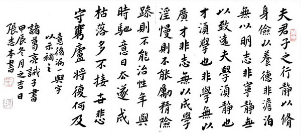 恩师之于书道也,五十载沉潜魏晋,追秦汉,法唐宋,兀兀穷年,砚田未辍。挥翰若云鹤游天,沉墨如鼎彝立殿。至诚贯石,丹心裂金。小楷《离骚》,奉于案前,诸公览毕,举座皆惊,叹为观止,国展折桂,声名鹊起。十万字百米佛经长卷,藏家垂青。榜书巨制《诸葛亮戒子书》为北京人民大会堂所藏。